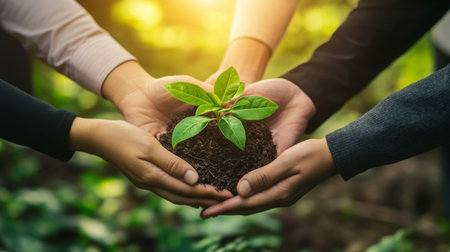 Two peoples hands holding young plant on blur nature background with sunlight. Eco earth day save the planet concept.