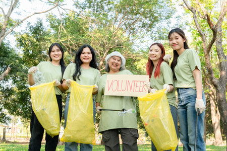 Volunteers participating in park cleanup activity, Group of cheerful volunteer women picks up trash in a verdant park