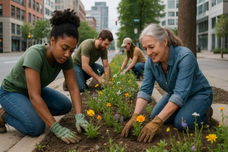 Volunteer Couple Planting Trees Together in a Park to Promote Environmental Conservation and Community Service