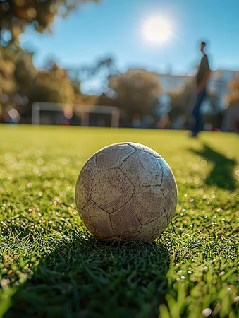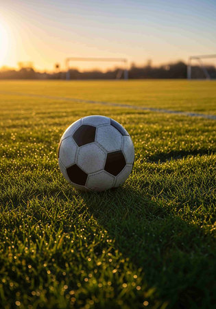 Soccer ball on a grassy field with goalposts in the background. Concept of sports equipment, outdoor activity, football game, athletic training.