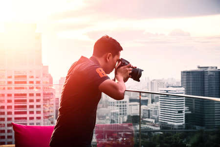 The picture of the professional photographer shooting the picture of nature with the camera and beautiful landscape under the sun light, cameraman require photography knowledge and creative. AIG43.