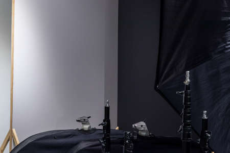 Black and white screen background in photography studio with light tripod and softbox modifier