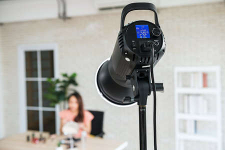 Behind the scene of beauty blogger live make up online. Studio light to shine the model in studio. E-commerce business concept.