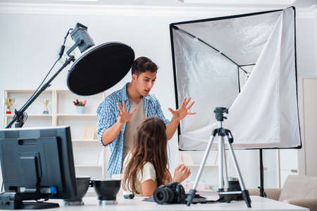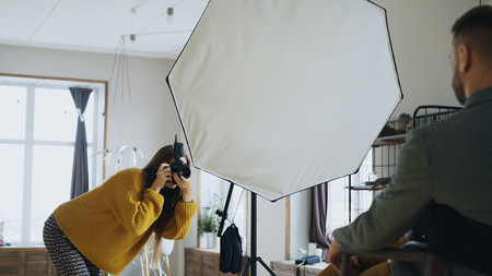 young male photographer shooting beautiful model in studio