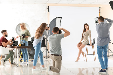Young photographers taking picture of woman in studio