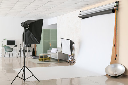Interior of a modern photo studio with professional equipment and lighting equipment