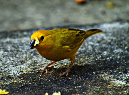 Beautiful colorful tropical yellow bird , Saffron finch, is foraging on the green grass of the lawn.