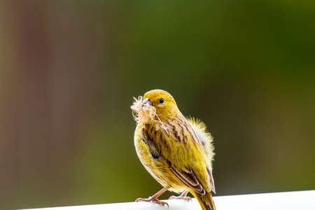 Vibrant yellow canary bird with some seeds on the beak, on top of a farm fence. Brazilian Canary.