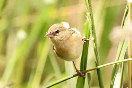 Yellow bird with feathers on the beak