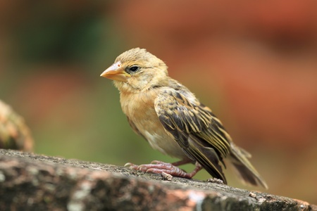 A female asian golden weaver with dull yellow colour , thick and powerful bill , pink in the bill and mild scaly pattern on the back.