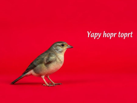Little goldfinch standing on a red background with text