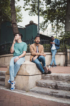 Group of young people in casual clothes sitting on the stairs in autumn park