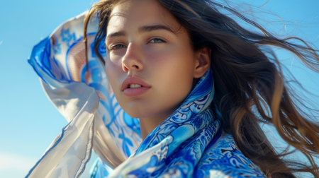 A hijab wrapped around a womans face its light fabric dancing in the wind like a delicate butterfly