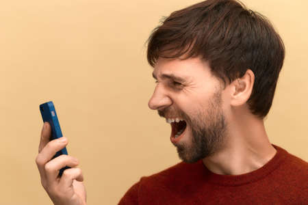 Photo of young man with beard wearing sweater screaming in anger and shock, using mobile phone, feeling frustrated about information on screen, posing against yellow background