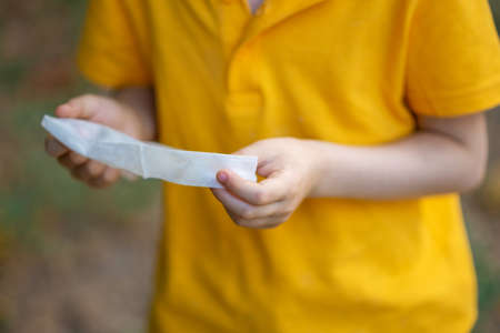A child looks and plays with matches, a dangerous activity for a toddler at home.