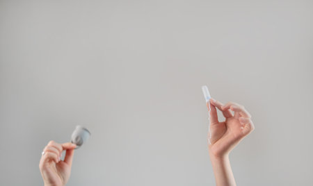 A woman holds a tampon in one hand and a menstrual cup in the other, comparing the benefits of each for menstrual care.