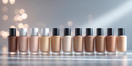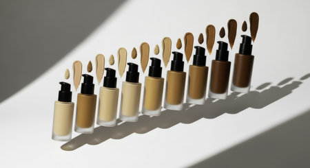 Various shades of foundation bottles arranged in a neat row showcasing diversity in skin tones