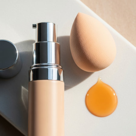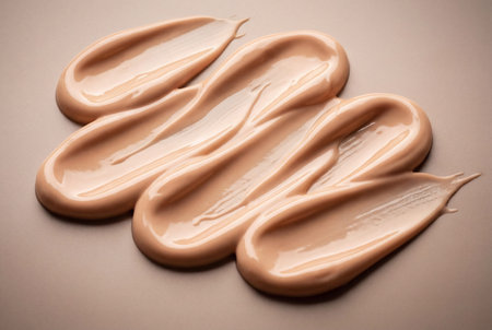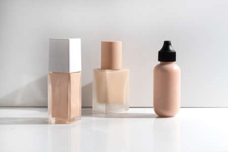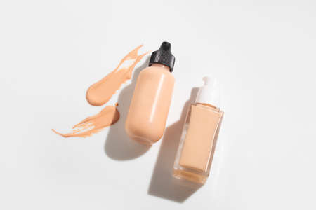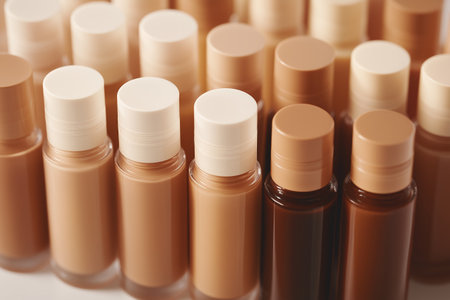 Beauty essentials: Close-up of liquid foundation shades on a white background, showing the diverse texture and high quality of makeup products.