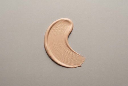 A single crescent shaped smear of beige liquid foundation or concealer displaying a smooth creamy texture isolated on a neutral grey background for cosmetic product concepts