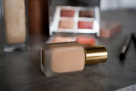 Makeup products for skin tone. Foundation, eye shadow palette in rose gold and nude colors closeup. Cosmetics for professional makeup artist