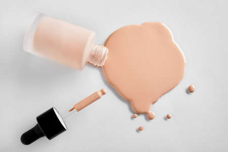 Mockup glass bottle of correction cosmetic product with pipette. Spilled Liquid foundation. Beauty branding concept