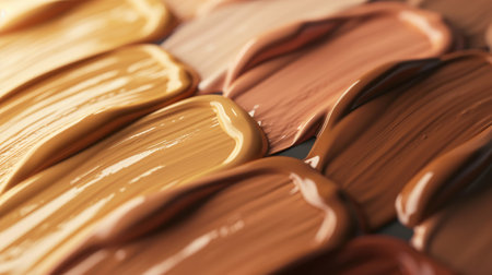 A collection of liquid foundation swatches displayed in a smooth and artistic manner, showcasing a range of diverse skin tones for beauty applications.