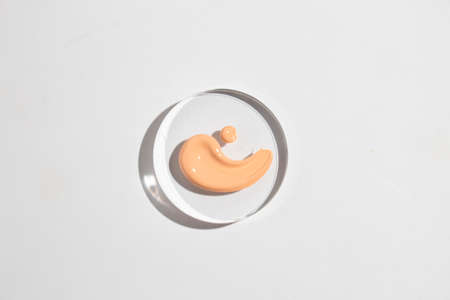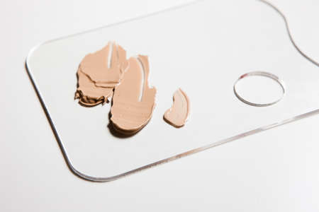 Cosmetic foundation swatch on palette on white background, close up. Professional make up product for face and concealer samples