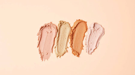 Three smudges of different shades of foundation or skin tone corrector on a soft off-white background, showcasing various skin tones and makeup products for beauty and cosmetics
