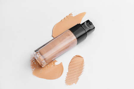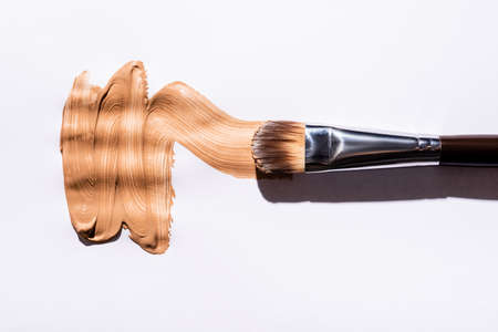 Foundation, concealer, face make-up smudge, smear. Cosmetic liquid foundation or cream beige color smudge, smear, stroke. Contouring, Make up smears background. Brush. Foundation texture.