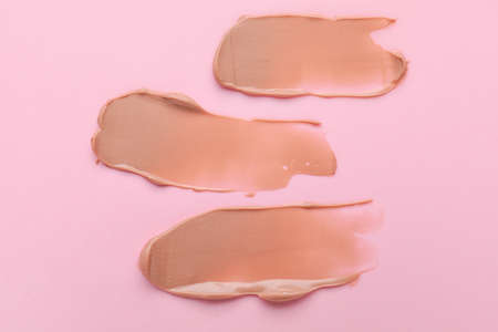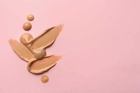 Samples of liquid skin foundation on pink background, top view. Space for text