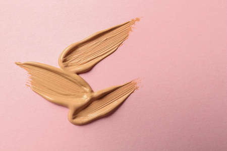 Concealer mat tube and cream smear on pink background. Beige foundation swatch. High quality photo