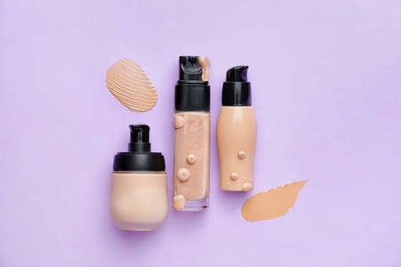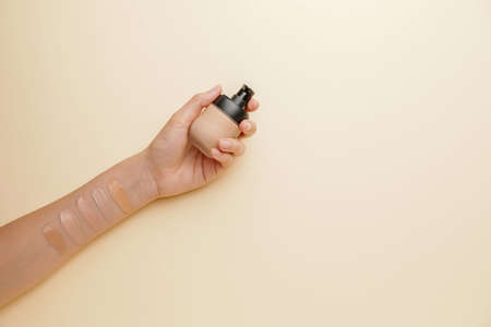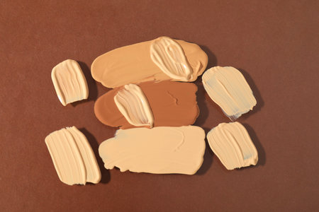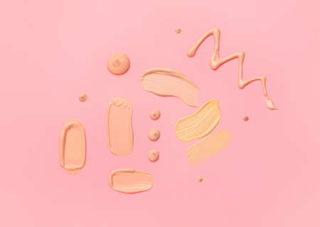 Different samples of make up of liquid foundation or concealer with vary skin tones. Beauty product swatches background