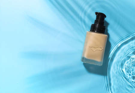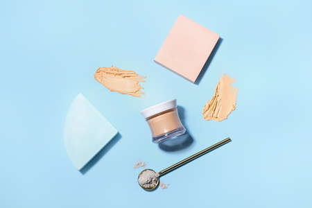 Liquid fluid foundation in tube on makeup sponge and brush makeup on blue background.