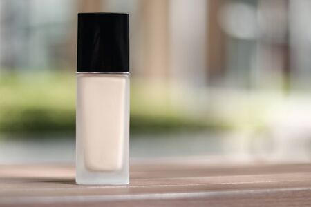 a glass bottle packaging shot of cosmetic foundation put in sun light