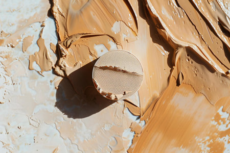 The image displays cosmetic textures and makeup samples. Various shades, including beige, white, orange, and gray, are presented. The composition features a circular element with split colors, and swatches are arranged on a textured backdrop. Ideal for beauty product promotion and related editorial content.