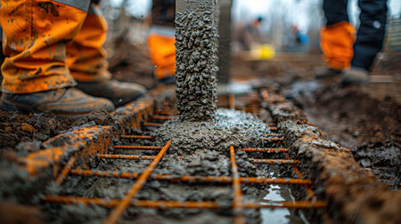 Workers pour wet concrete on the prepared surface for the construction of the foundation, under which steel reinforcement is visible to give strength to the structure.