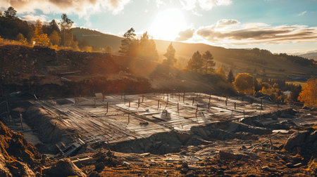 Sunset Over Mountain Construction Site with Partially Built Foundation. Concept of Building Projects, Scenic Landscapes, Engineering Innovation, and Natural Beauty.