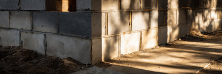 Sunlight casts shadows on newly constructed block walls at a building site, highlighting the materials and textures in the late afternoon.