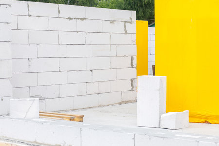 bricklayer builder working with autoclaved aerated concrete blocks. Walling, installing bricks on construction site, Engineering and constructions concepts.