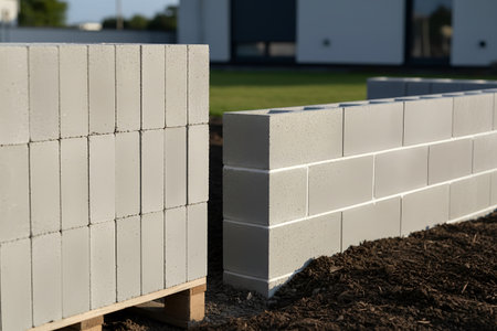 Neatly organized stack of cement blocks on a dusty site, symbolizing preparation for construction, building materials, and industrial work