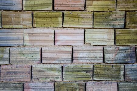 Detailed view at a colorful old and weathered brick wall texture. Panoramic background.