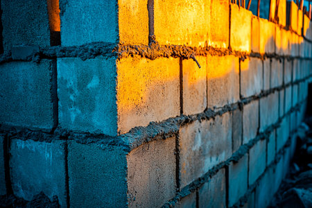 Warm hues of sunset cast a golden glow on the freshly laid brick wall. The textures and shadows enhance the architecture, showing skilled craftsmanship in this ongoing construction.