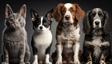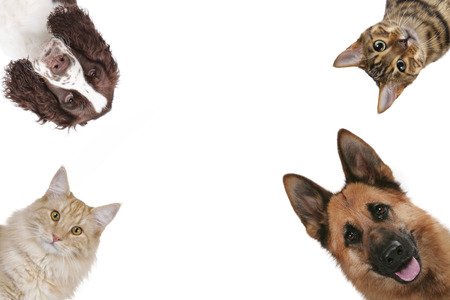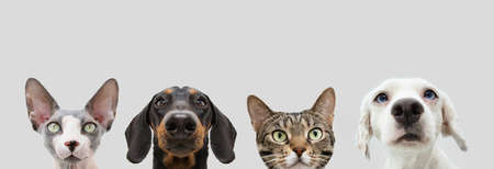 Banner four pets, cat and dog looking. Isolated on white gray background