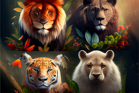 Collection of wild animal, white rhino, lion, bull and tiger.