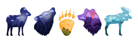 Silhouettes of Wild Animal and Footprint with Natural Forest Landscape Inside Vector Set