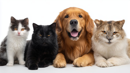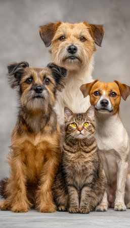 A charming ensemble of three playful dogs and a curious cat pose together against a plain backdrop, showcasing their unique personalities.