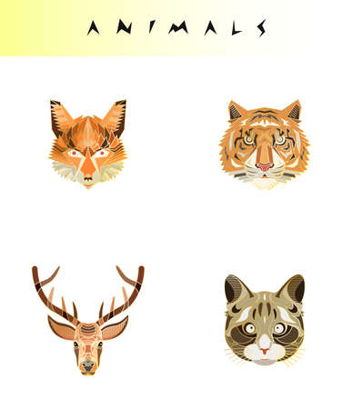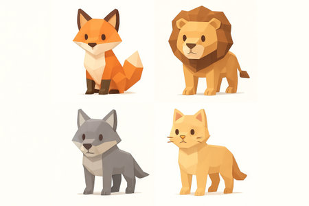 Cute animal sprites featuring fox, lion, wolf, and cat in simple illustrated style. concept of adorable wildlife art, playful digital characters, animal illustrations.