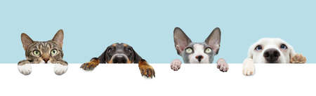 Cats and dogs peeking out on white background. Animals holding their paws on banner