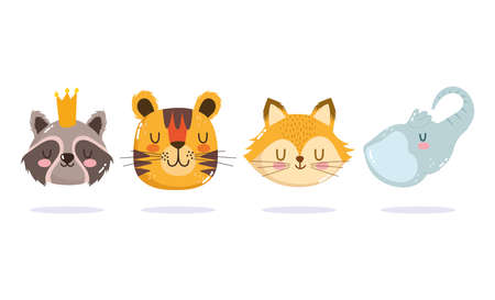 cute cartoon animal face adorable little raccoon with crown tiger fox elephant vector illustration