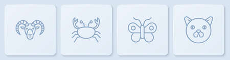 Set line Head of goat or ram, Butterfly, Crab and Cat. White square button. Vector